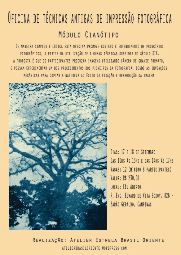 Oficina de Cianótipo em Campinas Posted on setembro 6, 2011 by Elizabeth Lee Oficina de cianotipia de uma amiga, Carol Vergotti. Compartilhe isso: Clique para compartilhar no Facebook(abre em nova janela) Facebook Clique para compartilhar no X(abre em nova janela) 18+ Curtir Carregando... Relacionado