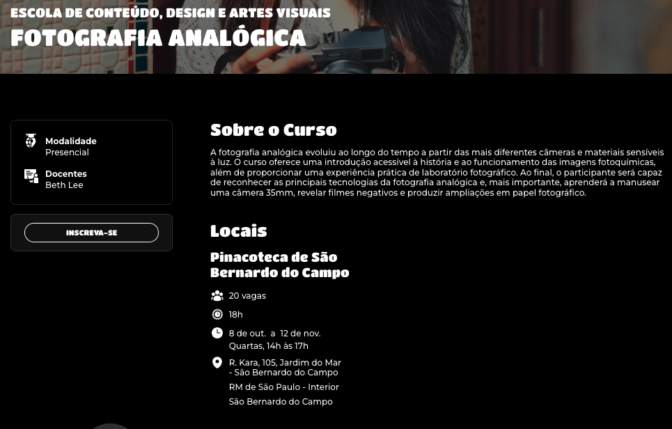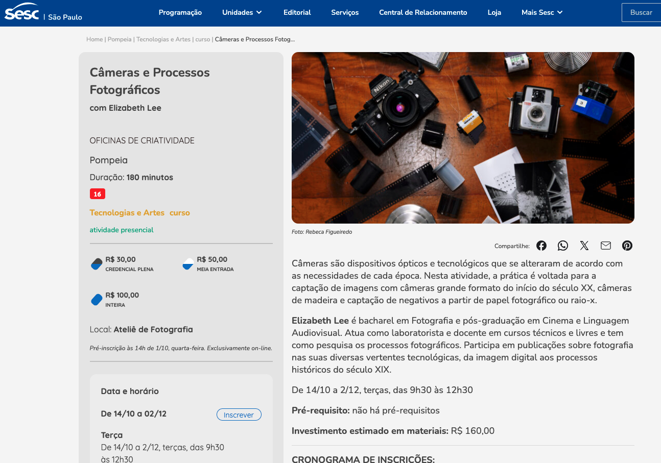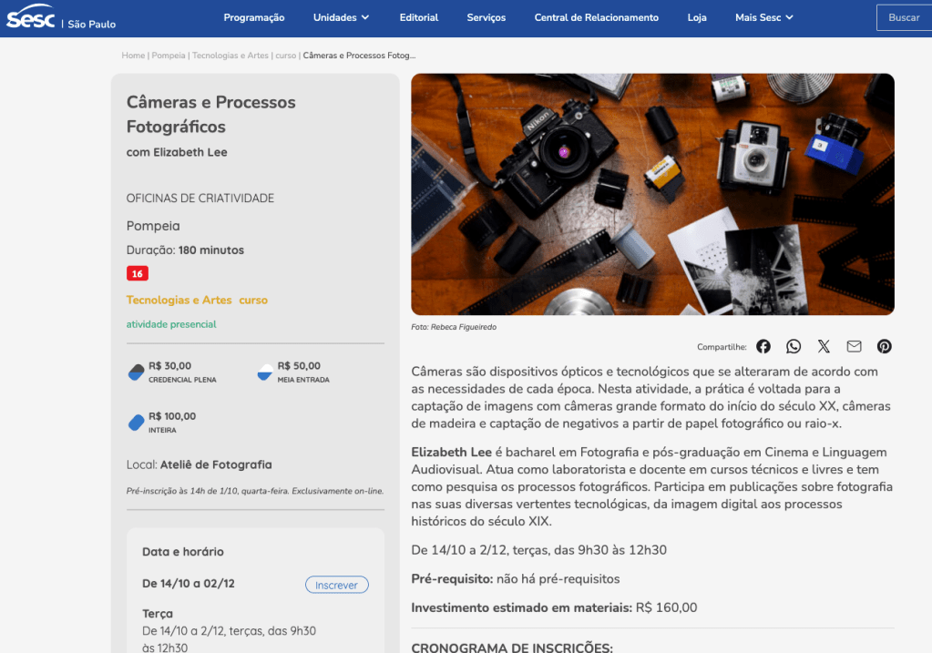 O curso do Sesc Pompéia inicia em agosto – agora – e as inscrições serão no dia 6/8 para credencial plena e 13/8 para público geral. Sempre a partir das 14h