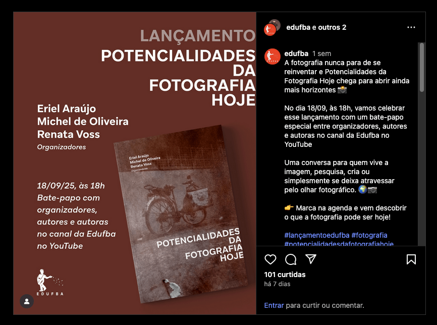 Algum tempo atrás fui convidada a participar desta publicação que será lançada dia 18 de setembro, 18h. A obra foi organizada por Eriel Araújo, Michel de Oliveira e Renata Voss e reúne textos de 7 pesquisadores sobre a fotografia.