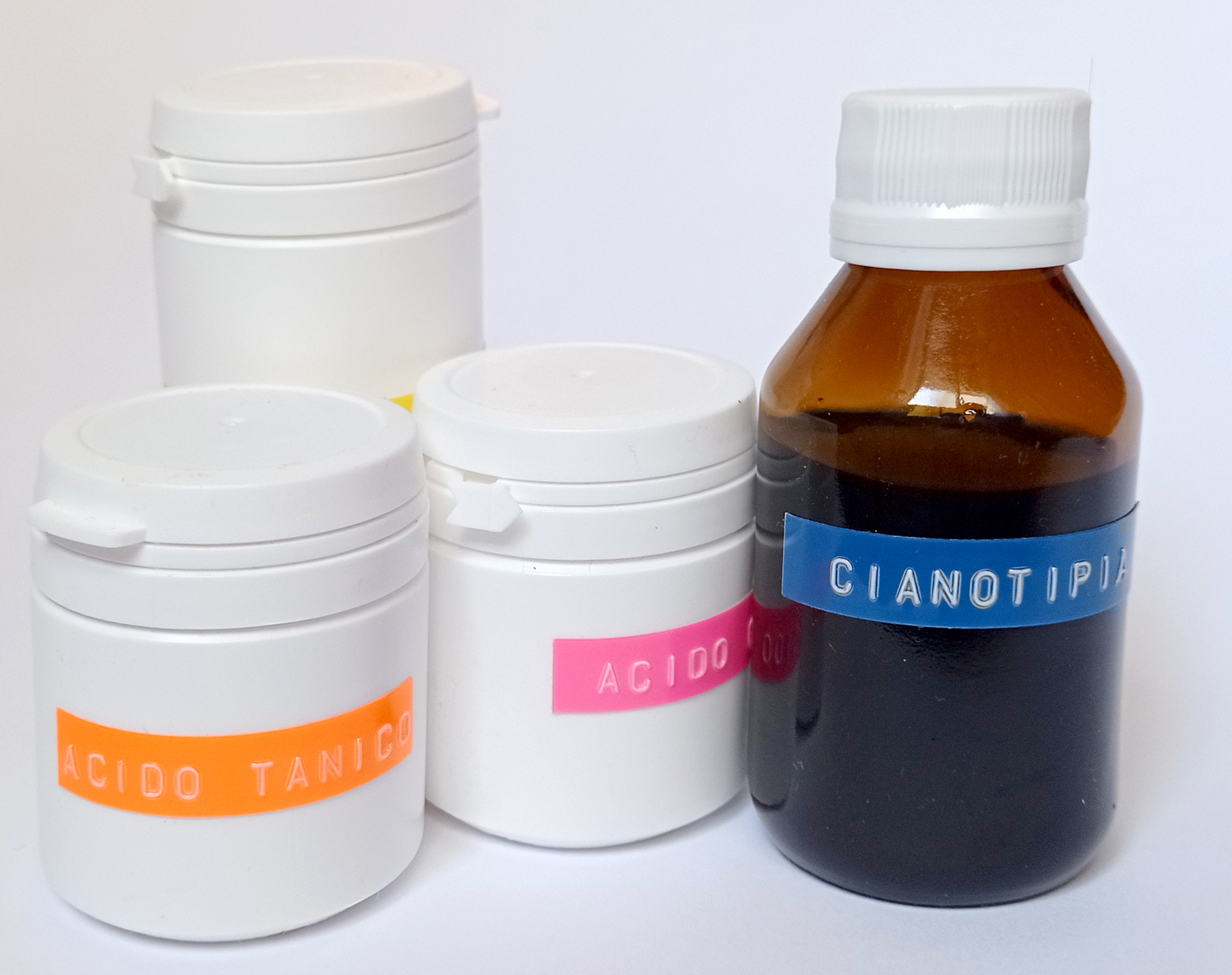 O kit pode ser produzido com o Citrato férrico amoniacal MARROM ou o Citrato férrico amoniacal VERDE. A cor no nome do químico se dá pela aparência do reagente mas seu resultado da imagem será sempre azul.