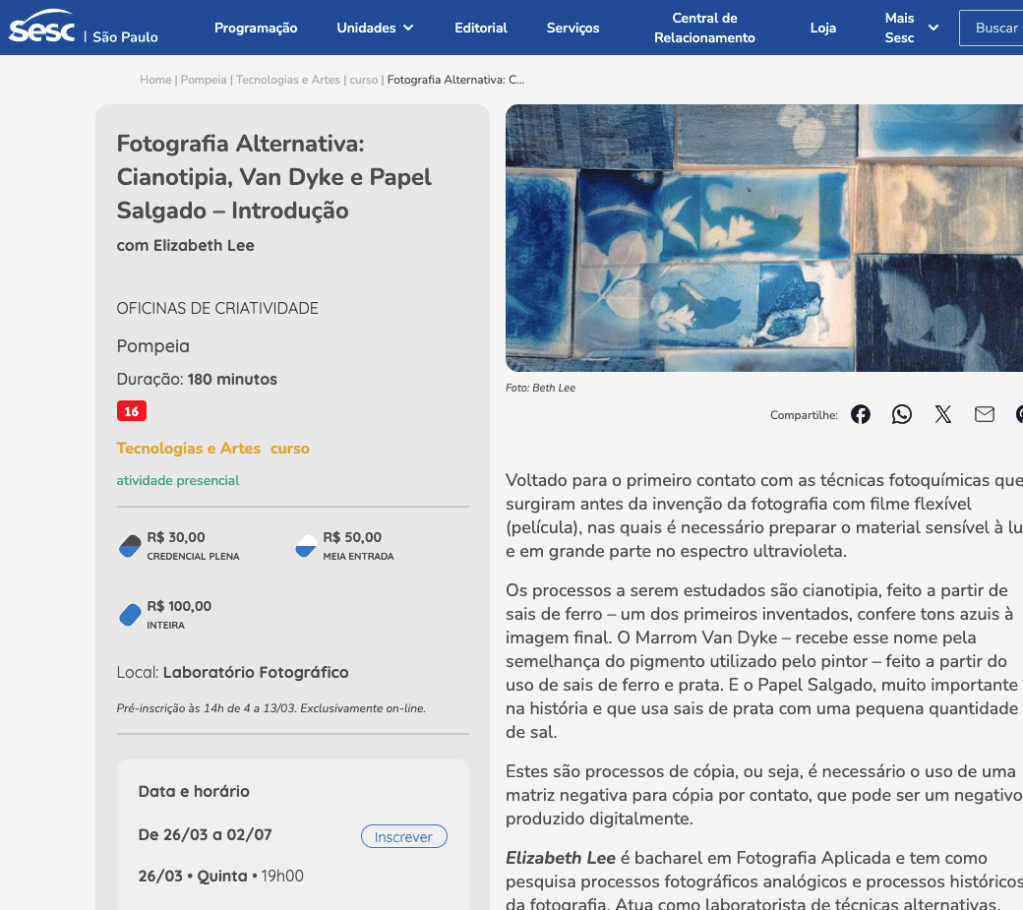 Teremos mais um curso no Pompéia, desta vez na programação do meio ambiente. Farei junto com a bióloga Beatriz de Castro a atividade de coleta de plantas do entorno da unidade e utilizá-las como matriz para cianotipias.