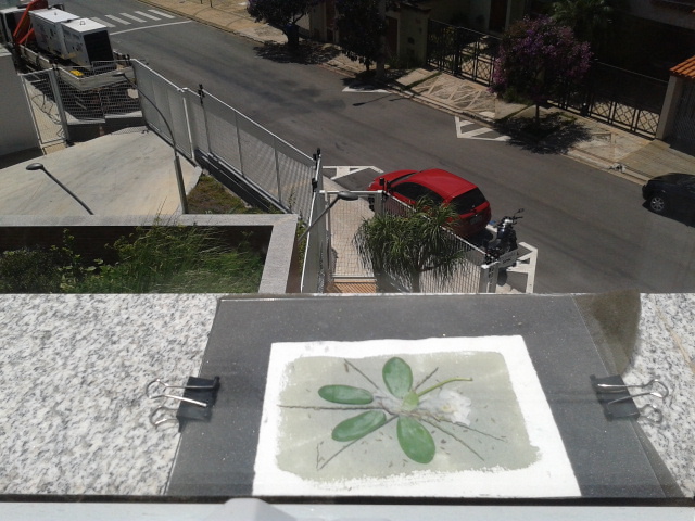 Chegando em casa fui fazer um teste e era isso mesmo. Deixei um Filiperson 90g e um Fine Face 140g ao sol. O Filiperson funcionou bem com o tempo que sempre deixo, mas o Fine Face (é um papel de desenho) sumiu inteirinho. Antes de acreditar que ele não serviria, pois eu já tinha usado ele e sabia que funcionava, deixei com mais tempo de exposição ao sol e ele ficou lindão. Na verdade eu recomendo esses papéis para quem está começando a utilizar esses processos porque são baratos, mas gosto mais dos papéis de gravura e aquarela. A diferença é que esses papéis demandam mais preparo inicial.
