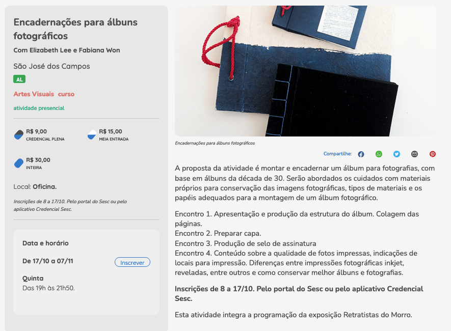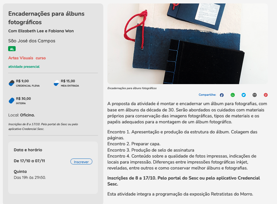 Estarei no Sesc São José dos Campos com o curso de encadernação de álbuns junto com a Fabiana Won. Quintas-feiras dias 17, 24, 31 de outubro e 7 de novembro. 19h.