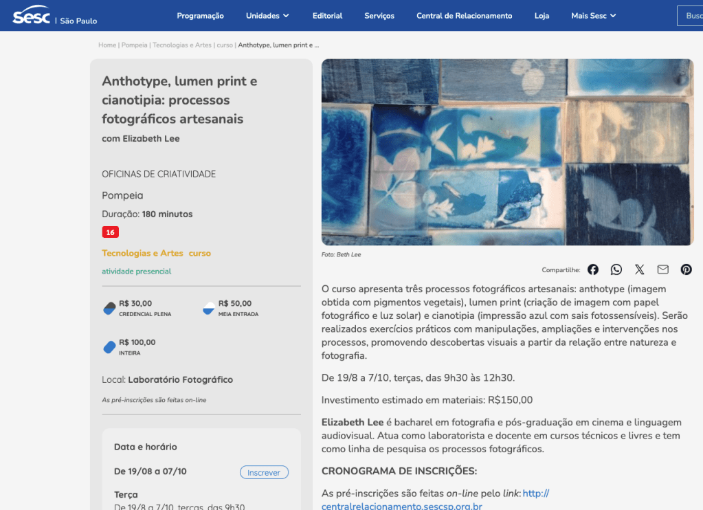 Teremos mais um curso no Pompéia, desta vez na programação do meio ambiente. Farei junto com a bióloga Beatriz de Castro a atividade de coleta de plantas do entorno da unidade e utilizá-las como matriz para cianotipias.