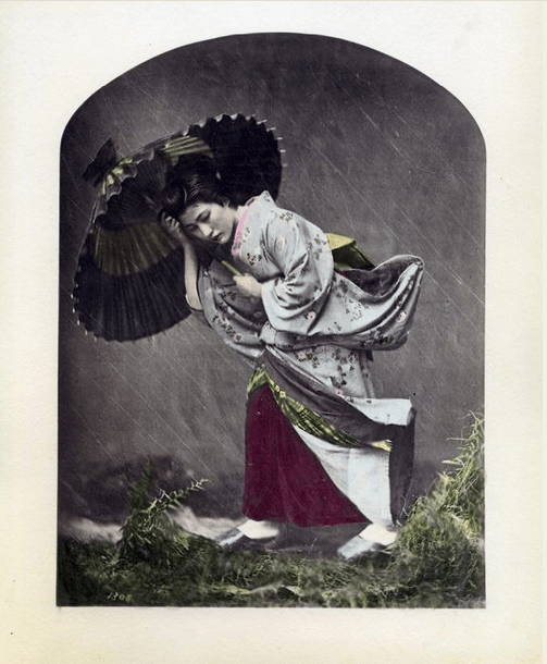 Muitos elementos me fizeram pensar sobre a imagem. É uma cena quase teatral, nesse período histórico algumas imagens eram produzidas no Japão para serem vendidas a estrangeiros. O recorte é típico de imagem estereoscópica, mas talvez não fosse esse o caso, com o arco acima. Lembro-me que na palestra foi comentado sobre o registro da chuva serem riscos na própria imagem o que aplica mais ainda a noção de algo teatral. A colorização sempre me confundiu um pouco. Até que ponto a ideia de aplicar cor em cima de uma fotografia ajuda ou não na leitura da imagem, sendo que cores nesse momento histórico deviam ter uma carga social, no sentido de que muitos tecidos eram caríssimos devido ao tingimento especial e às vezes até associado a um tipo de status (não pesquisei isso muito a fundo ainda). Também, não sei até onde a colorização ajuda a distrair sobre uma realidade e história fotográfica, tenho pensado sobre isso.